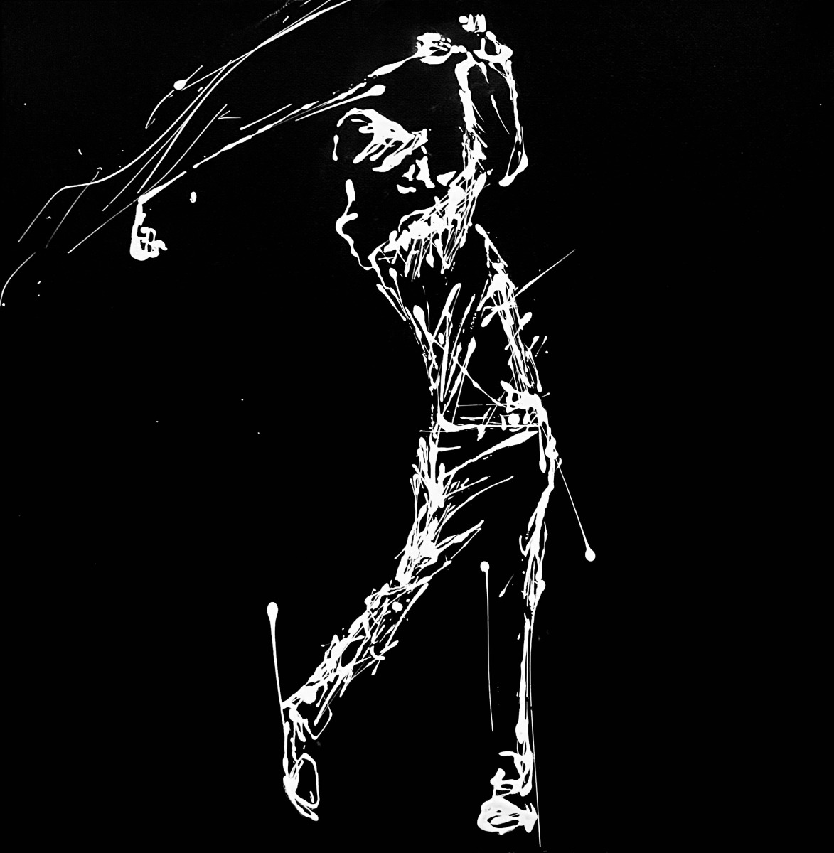 Note curatoriale : GOLFEUR 3 fonctionne comme une inversion du mouvement précédemment observé. La figure, orientée dans le sens opposé, introduit une nouvelle lecture du swing, moins axée sur la précision que sur la fluidité. Les coulées de peinture blanche, plus présentes, accompagnent le geste et prolongent le mouvement au-delà du corps. Le profil inversé crée une tension visuelle, comme un écho ou un contrepoint aux autres œuvres de la série. Le fond noir mat absorbe l’espace, laissant au blanc le rôle de révéler l’énergie du geste, dans un équilibre entre contrôle technique et abandon à la matière.