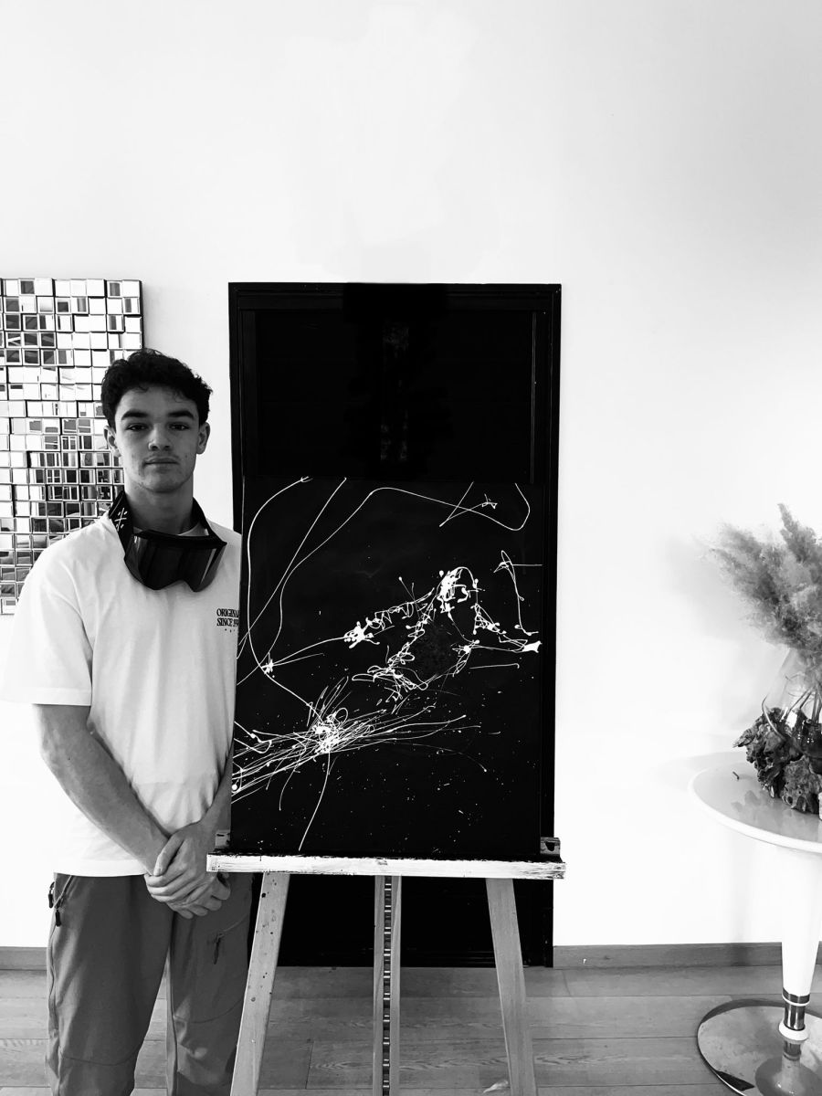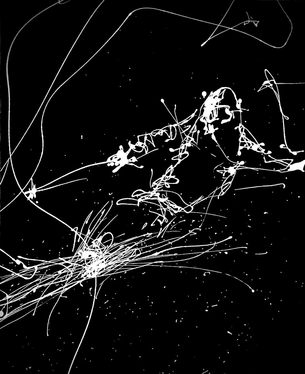 Note curatoriale : LE SKIEUR 1 capture l’athlète au cœur du virage, dans un instant de maîtrise et de vitesse. Le corps s’incline, guidé par un regard fixe, tandis que les bâtons accompagnent le mouvement dans une gestuelle presque chorégraphique. Les coulées et projections de peinture blanche évoquent la neige projetée lors de la descente, prolongeant le geste au-delà de la figure. Le fond noir mat isole la scène et renforce la sensation de profondeur, laissant au blanc le rôle de traduire l’énergie et la fluidité du mouvement. L’œuvre met en tension contrôle et glisse, dans une dynamique où le corps et la matière ne font plus qu’un.