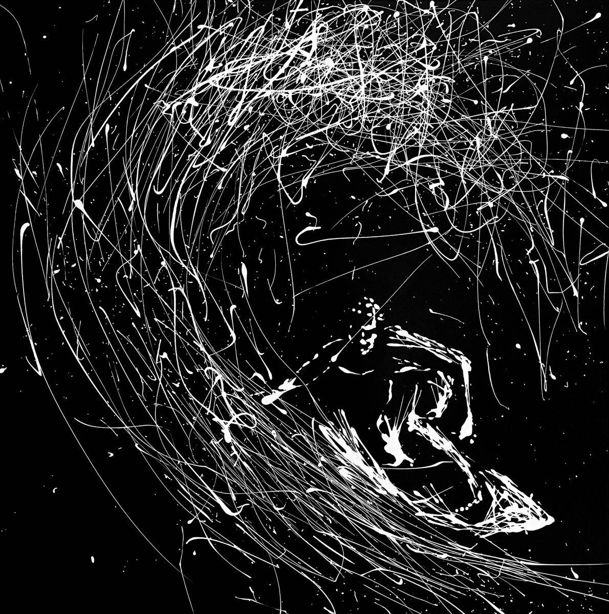 Note curatoriale : Un surfeur apparaît de face, engagé au cœur de la vague, porté par la puissance des rouleaux. Les coulées de blanc, fluides et organiques, traduisent à la fois le mouvement de l’eau et la glisse du corps, fusionnant la figure et l’élément naturel. Sur le fond noir, la scène se réduit à l’essentiel : l’instant de tension et d’équilibre entre maîtrise et abandon. Entre abstraction et figuration, l’œuvre capte l’énergie brute du surf et la relation directe entre l’athlète et la vague.