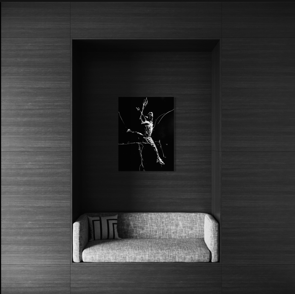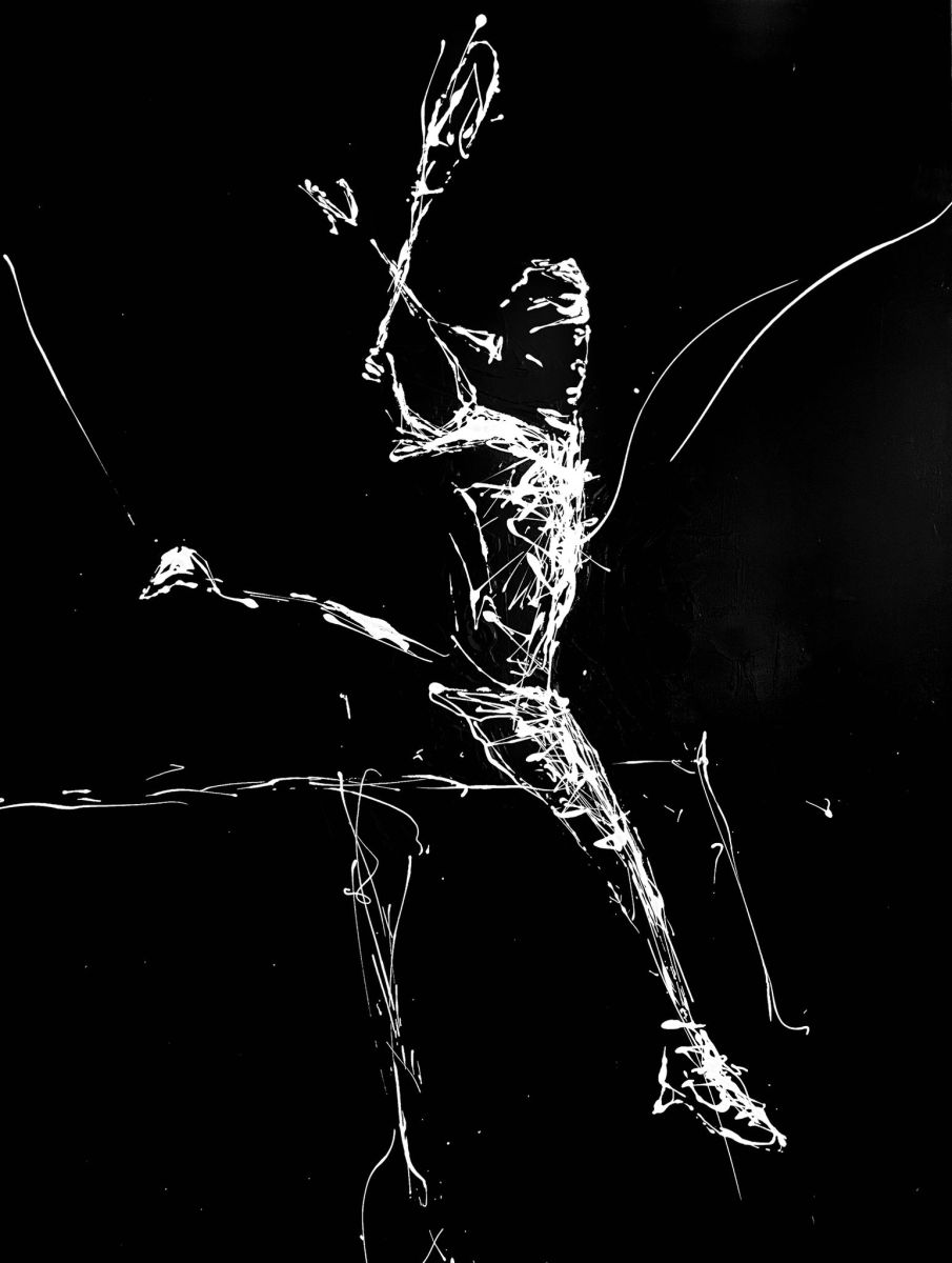Note curatoriale : La figure d’un joueur de tennis surgit dans un mouvement suspendu, capté au cœur d’un revers à une main exécuté en plein saut. Le geste, ample et aérien, évoque une danse plus qu’une performance sportive, où le corps semble flotter hors du temps. Les coulées de blanc, fluides et organiques, dessinent l’élan et la tension du mouvement sur un fond noir absolu, réduisant la scène à l’essentiel. Entre abstraction et figuration, l’œuvre met en lumière la grâce, la précision et la dimension presque chorégraphique du geste athlétique.