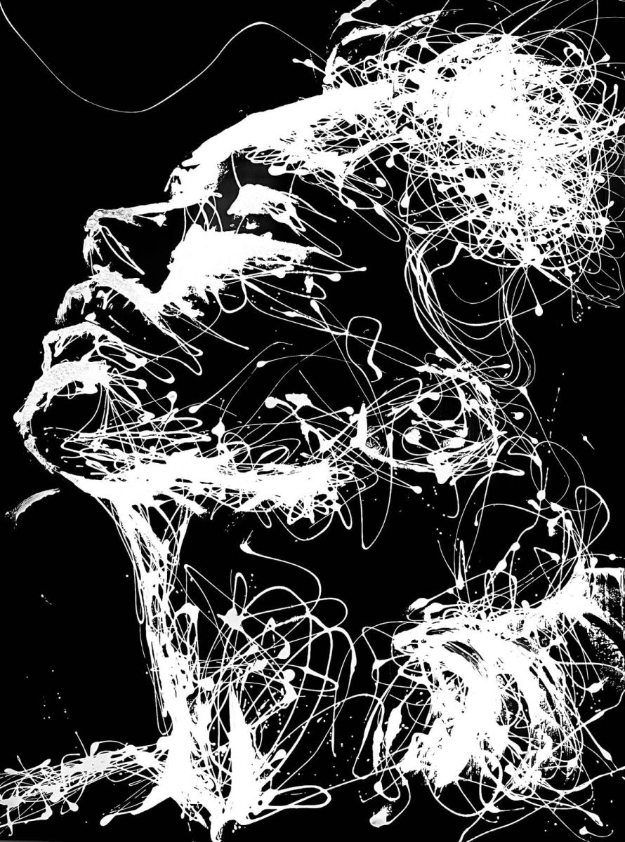 Note curatoriale : La femme 1 s’inscrit dans une recherche sur la figure féminine comme présence plus que comme représentation. Le corps n’est jamais totalement défini : il apparaît par fragments, par tensions, par superpositions de gestes. Les projections et tracés blancs viennent inscrire le mouvement, presque nerveux, tandis que le fond noir agit comme un espace de retrait, de silence. L’œuvre joue sur l’équilibre entre contrôle et lâcher-prise, laissant émerger une silhouette instable, traversée par l’énergie du geste pictural. La brillance des matières accentue cette impression de vibration, donnant à la figure une présence à la fois physique et insaisissable.