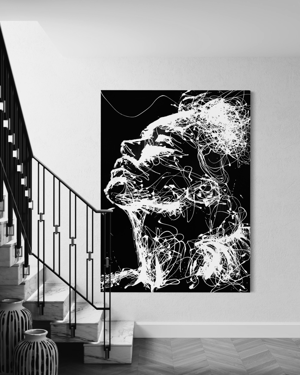 Technique : Peinture blanche brillante et noire brillante sur toile