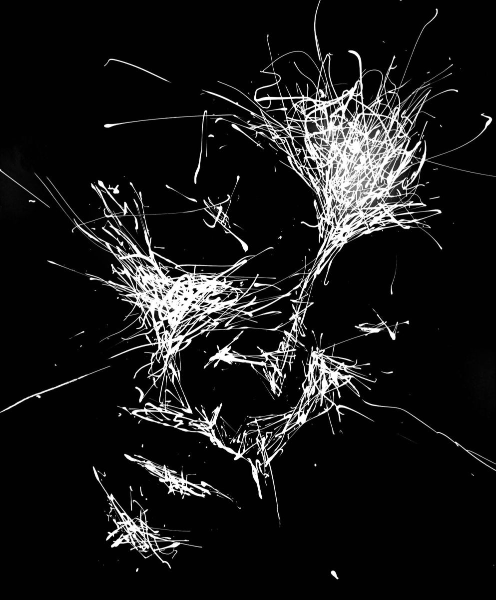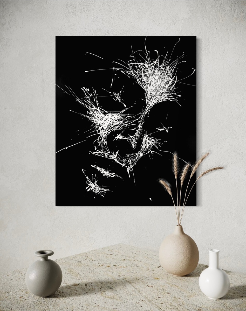 Note curatoriale : Cette œuvre laisse apparaître le visage d’une femme, le regard tourné vers le bas, comme suspendu dans un moment d’introspection. À travers le contraste entre noir mat et blanc brillant, la figure se fragmente et se reconstruit par le geste, suggérant une émotion retenue, presque silencieuse. La lumière du blanc souligne les traits essentiels, laissant au spectateur la liberté de ressentir plus que de comprendre.