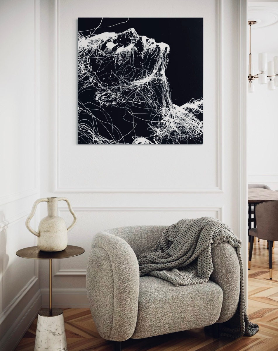 Technique : Peinture blanche brillante et noire brillante sur toile