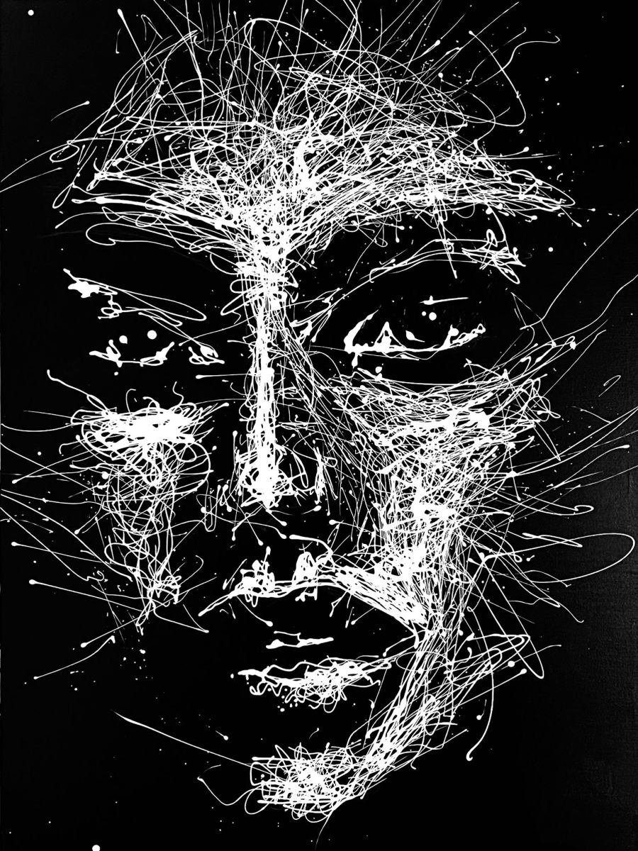 Note curatoriale : LA FEMME 7 propose une figure frontale dont le regard ouvert instaure une relation directe avec le spectateur. Le visage se construit dans une trame dense de lignes blanches, où le geste dessine plus qu’il ne décrit. La frontalité renforce la présence de la figure, tandis que les yeux ouverts introduisent une tension entre exposition et vulnérabilité. Le contraste entre la peinture blanche brillante et le noir mat accentue la profondeur de l’espace et stabilise la composition. L’œuvre affirme une présence assumée, presque silencieuse, où le regard devient le point d’ancrage de toute la composition.